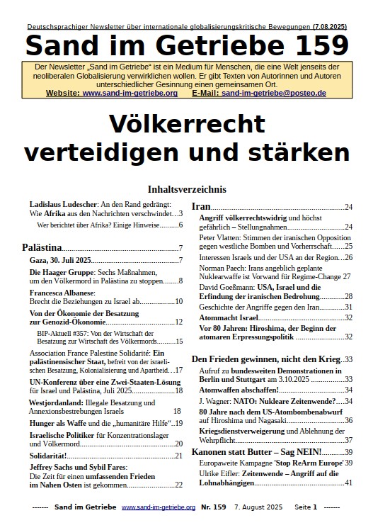 Die Welt muss dringend handeln, um die Palästinenser in Gaza zu retten, erklären Vertreter von UN-Organisationen. 25 deutsche Organisationen heben hervor: Das Völkerrecht kennt keine Staatsräson! Helga Merkelbach stellt die Pläne von Trump für Gaza. Die Palästinensische Nationalkonferenz ruft zum Wiederaufbau der PLO auf.