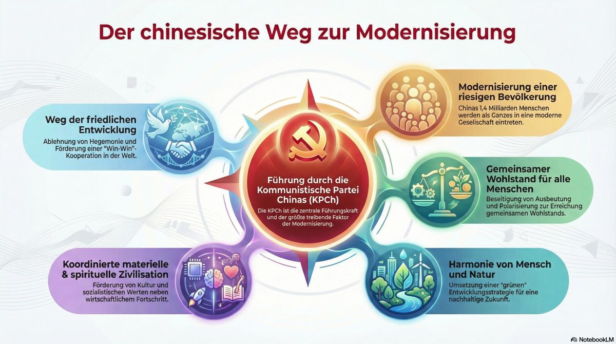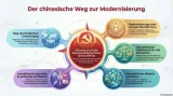 Die Modernisierung chinesischer Prägung wird als ein eigenständiger Weg definiert, der sich von westlichen Modellen unterscheidet und auf den spezifischen nationalen Bedingungen Chinas beruht. Sie wird als umfassender Prozess der Transformation von Wirtschafts- und Sozialstrukturen durch Industrialisierung, technologischen Fortschritt und die Entwicklung des Humankapitals beschrieben.